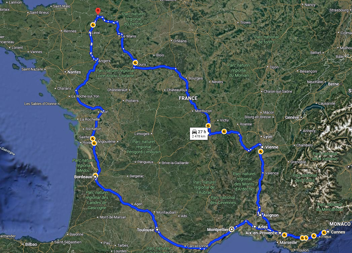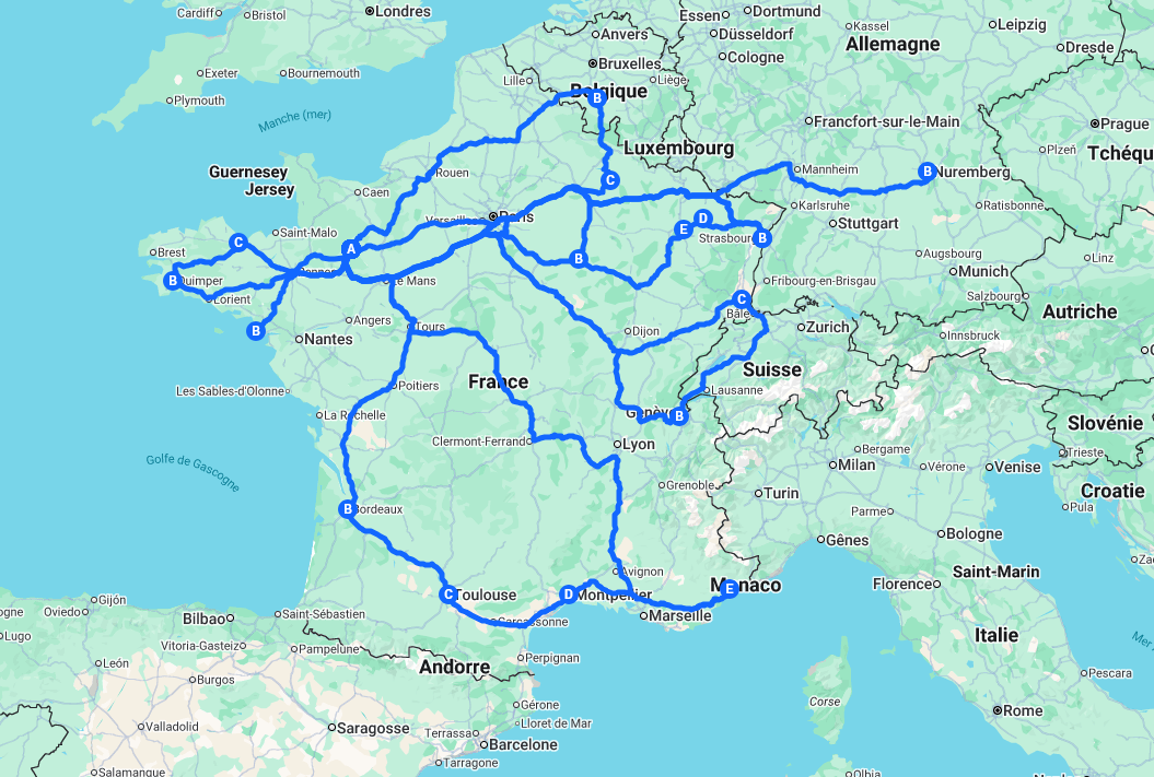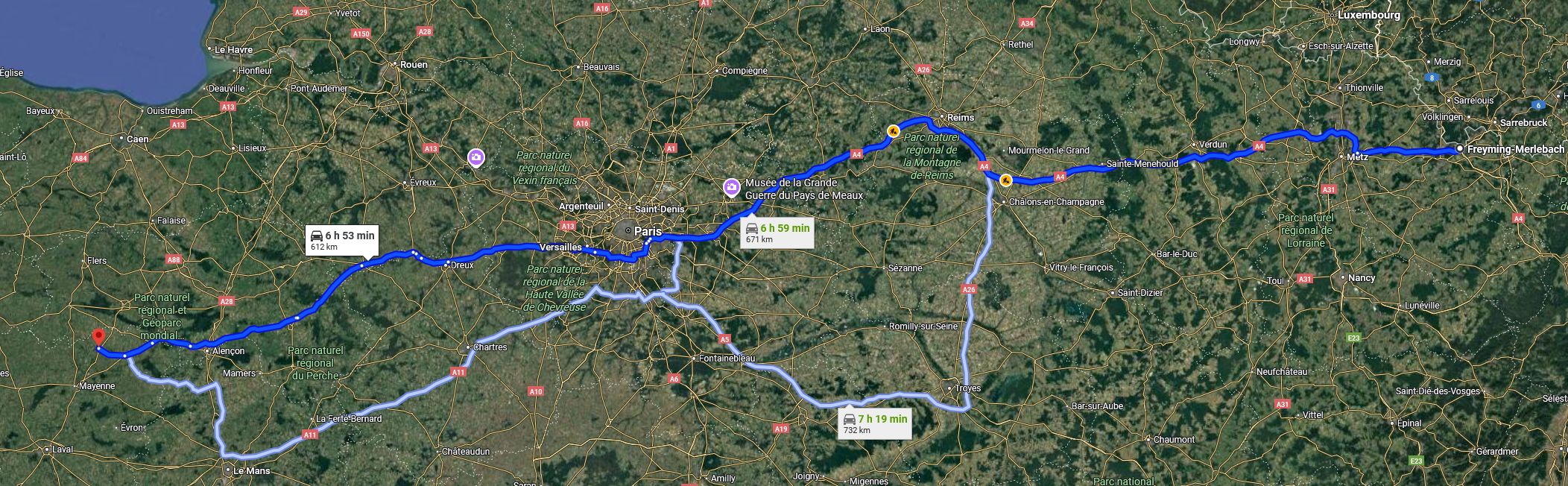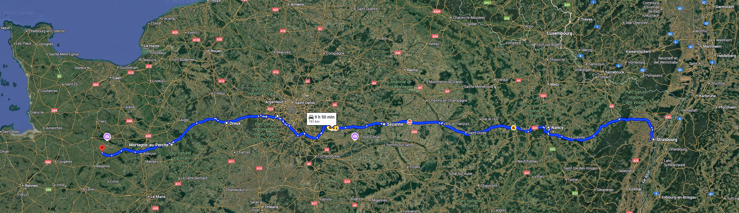 Trajet à l'aller : Mayenne - Mortagne-au-Perche - Dreux - Versailles - Sézanna - Saint-Dizier - Nancy - Strasbourg