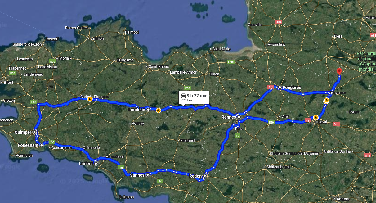 Trajet à l'aller : Mayenne - Vitré - Rennes sud - Locminé - Lorient - Fouesnant